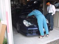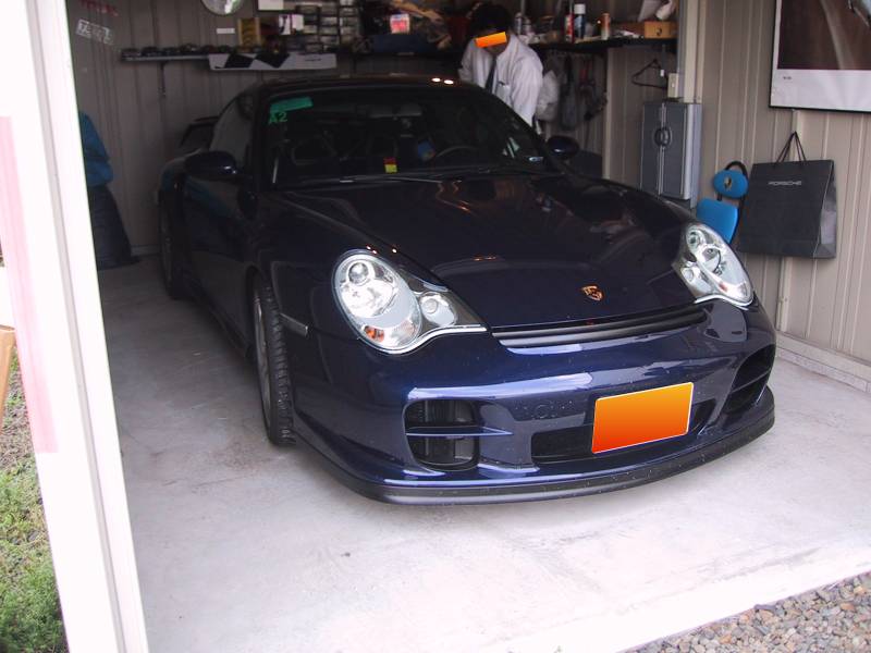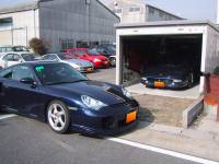 駐車場の一角には立派なガレージが・・・扉を開けるとポルシェが!レースへ参加のため前日まで鈴鹿サーキットへ行っていたそうです。