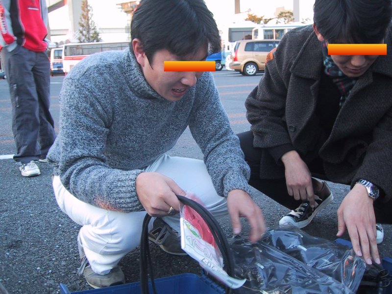 でぶねこさんからもらった『オカモト』のゴムを嬉しそうに開けてみるおさるさん(左)