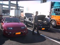 すでに到着していたおさる号(左)と、タイミングベルトが切れてエンジンが壊れたものの、みごと復活を果たしたたかひろ号(右)です。