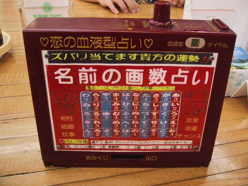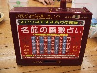 水分峠のレストランにて・・・・「恋の血液型占い」と書いてあるのに説明は「名前の画数占い」とふざけた内容です。上部に画数に対応したダイヤルが付いていましたが、これはハッタリでしょう(笑)