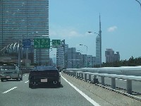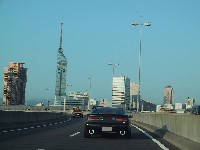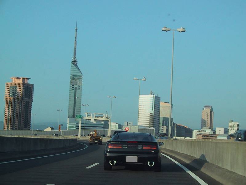 百道付近を走行中です。 目の前の大きな建物はホテル・シーホークです。福岡タワーも右手に見えます。