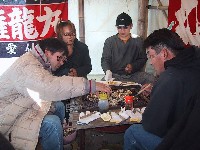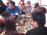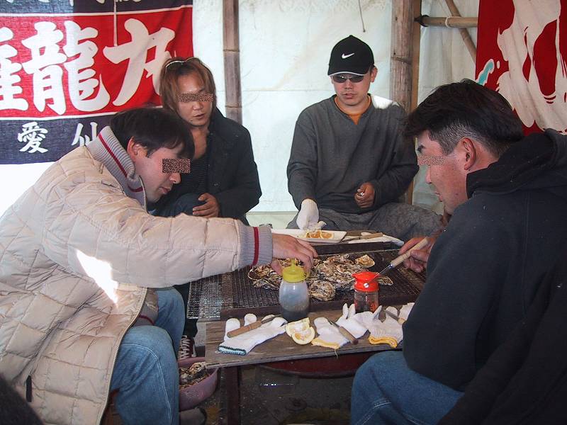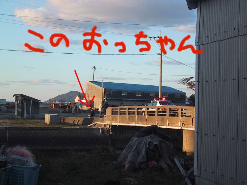 牡蠣焼き小屋の手前に酔っ払いのおっちゃんが寝ころんでいましたが案の定、おまわりさんが来ていました(爆)