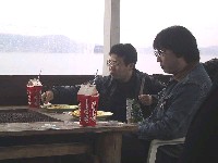 雨も降ってきましたので室内でお食事です。 Z燦々さんとDebooさんはどことなく似ている二人です。 「わさビーフ」を食べているのはZ燦々さんです。