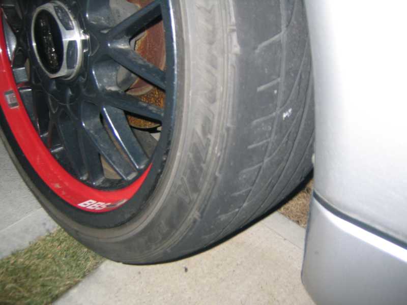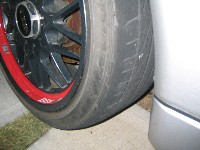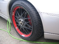 うはー!ホイールもタイヤも汚れてますねー。先日の黄砂でめちゃくちゃです。肝心なタイヤの空気圧ですが、この写真ではとりあえずぺちゃんこ状態を脱しています。全体的にショルダー部が丸っこい感じなのがわかるでしょうか?